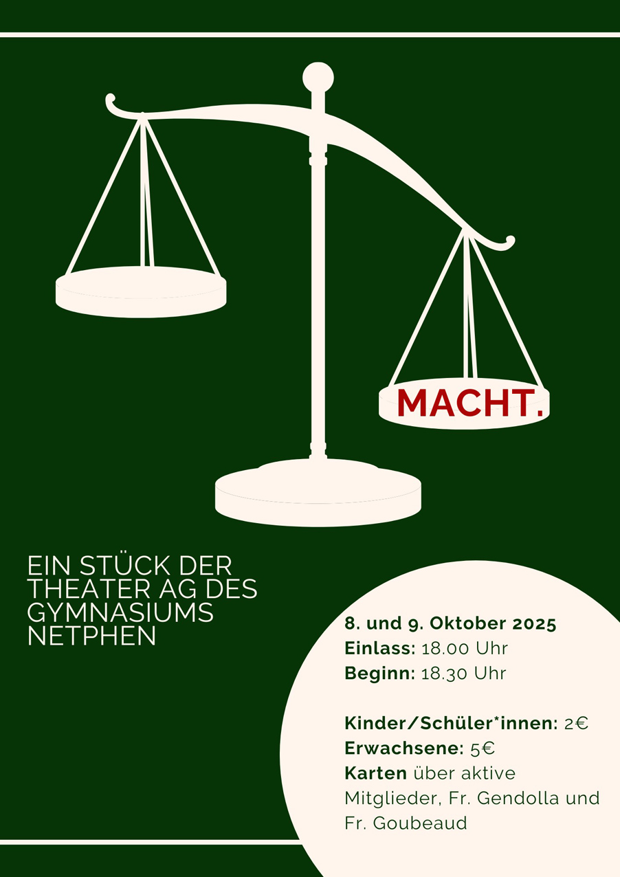 Lange haben sich die Mitglieder der Theater-AG des Gymnasiums Netphen mit Fragen rund um dieses omnipräsente Phänomen auseinander gesetzt: Gibt es eine „gute“ und eine „schlechte“ Macht? Wie wirken sich Machtverhältnisse auf Menschen aus und in welchen Bereichen des Lebens fällt uns ein Machtmissbrauch ganz besonders auf?