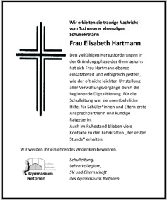 | Frau Elisabeth Hartmann 1939 – 2020 Im Dienst als Schulsekretärin am Gymnasium Netphen bis 2002 Zum Nachruf auf unserer Webseite |